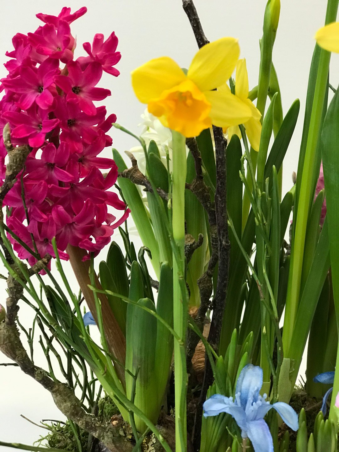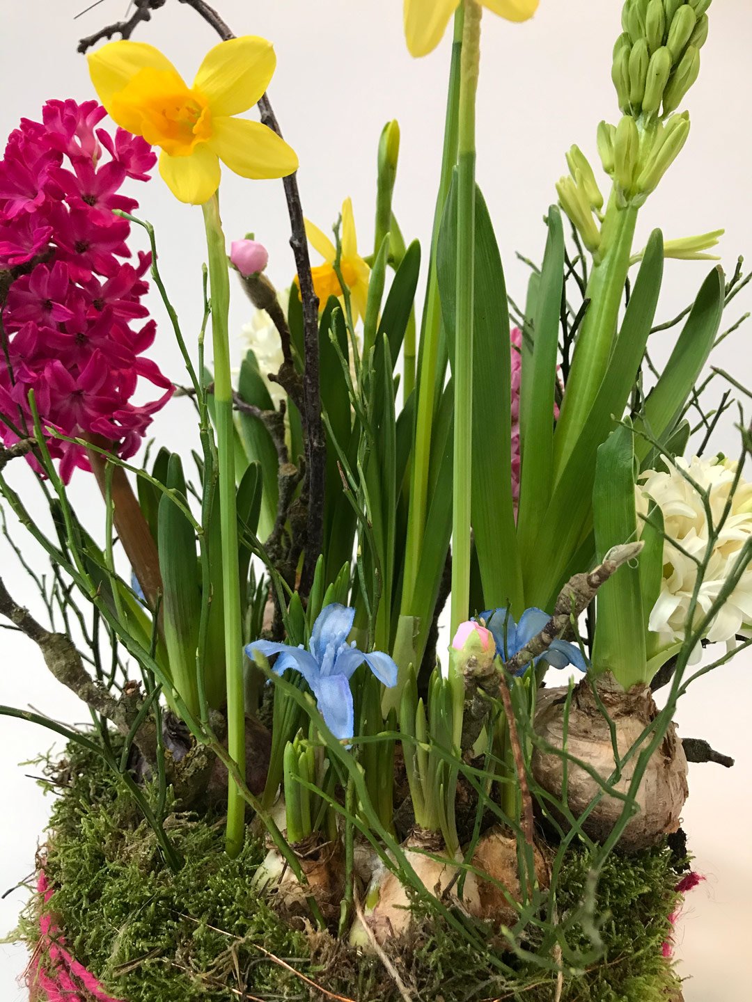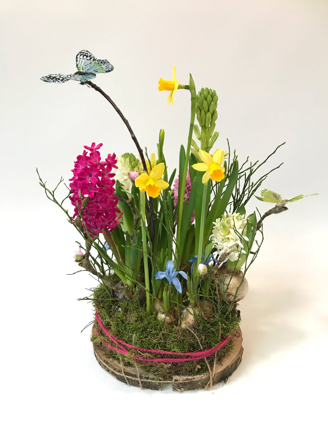 Deze bonte voorjaarsbollen taart is gemaakt van de kleurrijkste bollen, met mos en takken en een kleurrijke vlinder afgewerkt en op een houtschijf geleverd.